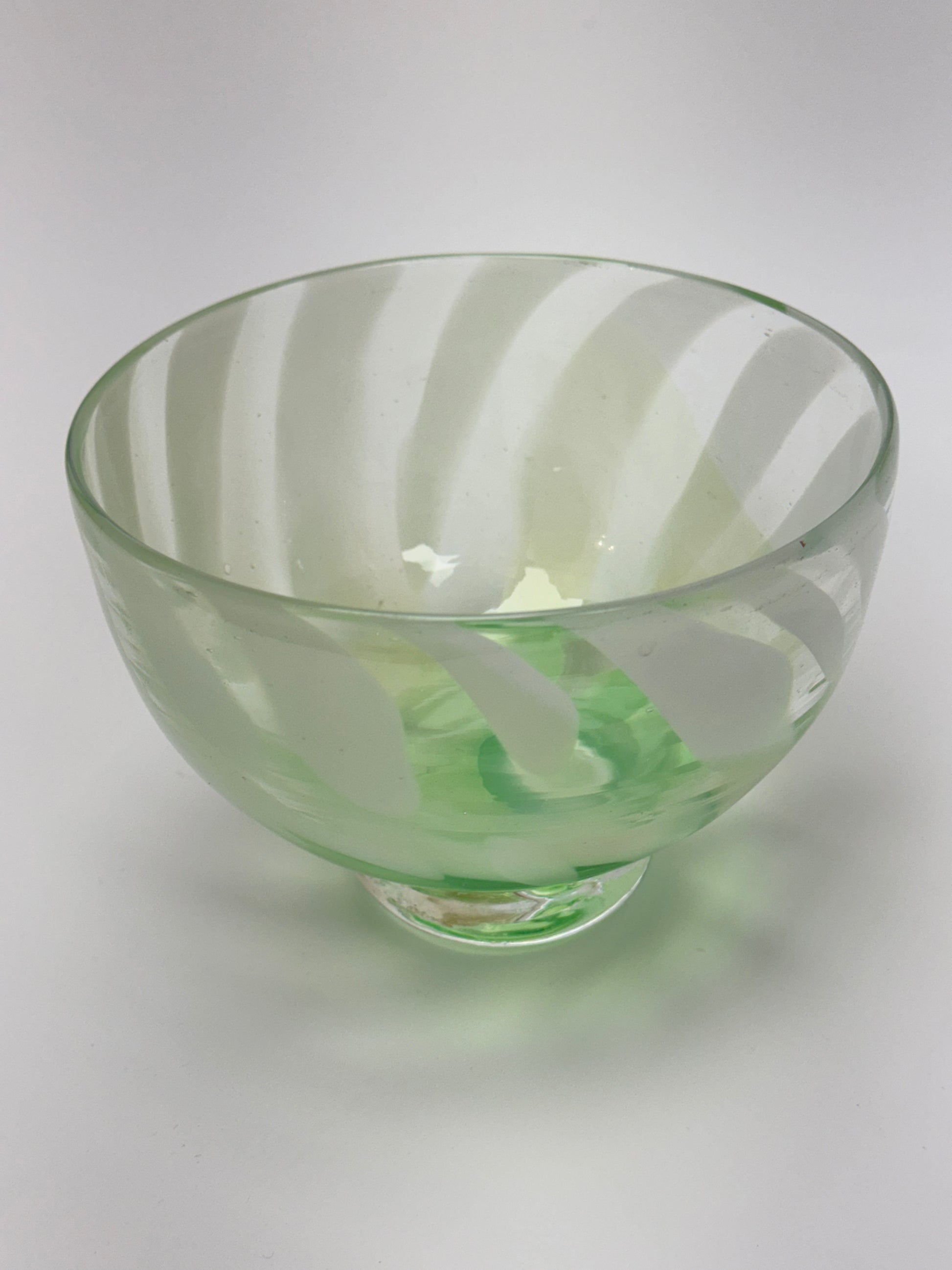 To make murrine, canes (glass rods containing concentric circles of color) are first assembled and pulled out in long rods roughly the diameter of a pencil. Then those canes are cut into segments and groups of those segments are bundled to form a colored pattern and are wired together. Then those bundles are heated and melted together and then stretched again, to form a rod roughly 1 inch in diameter that is then broken or cut into thin disks of patterned glass known as murrine. This process always leaves a less stretched “knuckle” at one or both ends of the pull. This bowl is blown into one of those knuckles. The result is a striped pattern of green and grey canes. At least three days of studio time go into fabricating complex canes and then the murrine pull itself, even before the bowl is made. This bowl is one of a kind and was blown by the artist (David L Smith) with a unique shape and pattern. Because this is hand-blown, there are small bubbles and tool marks present in the piece that are artifacts of the studio glass process. This bowl is a piece of art and is signed and dated by the artist. And it it a practical object as well, suitable for use every day. Hand washing recommended. Thanks for supporting independent artists!