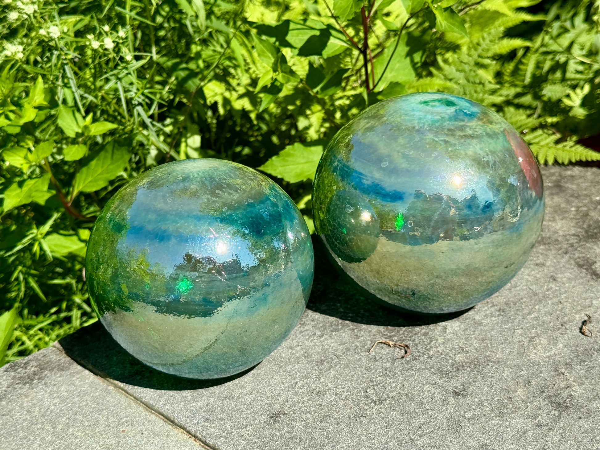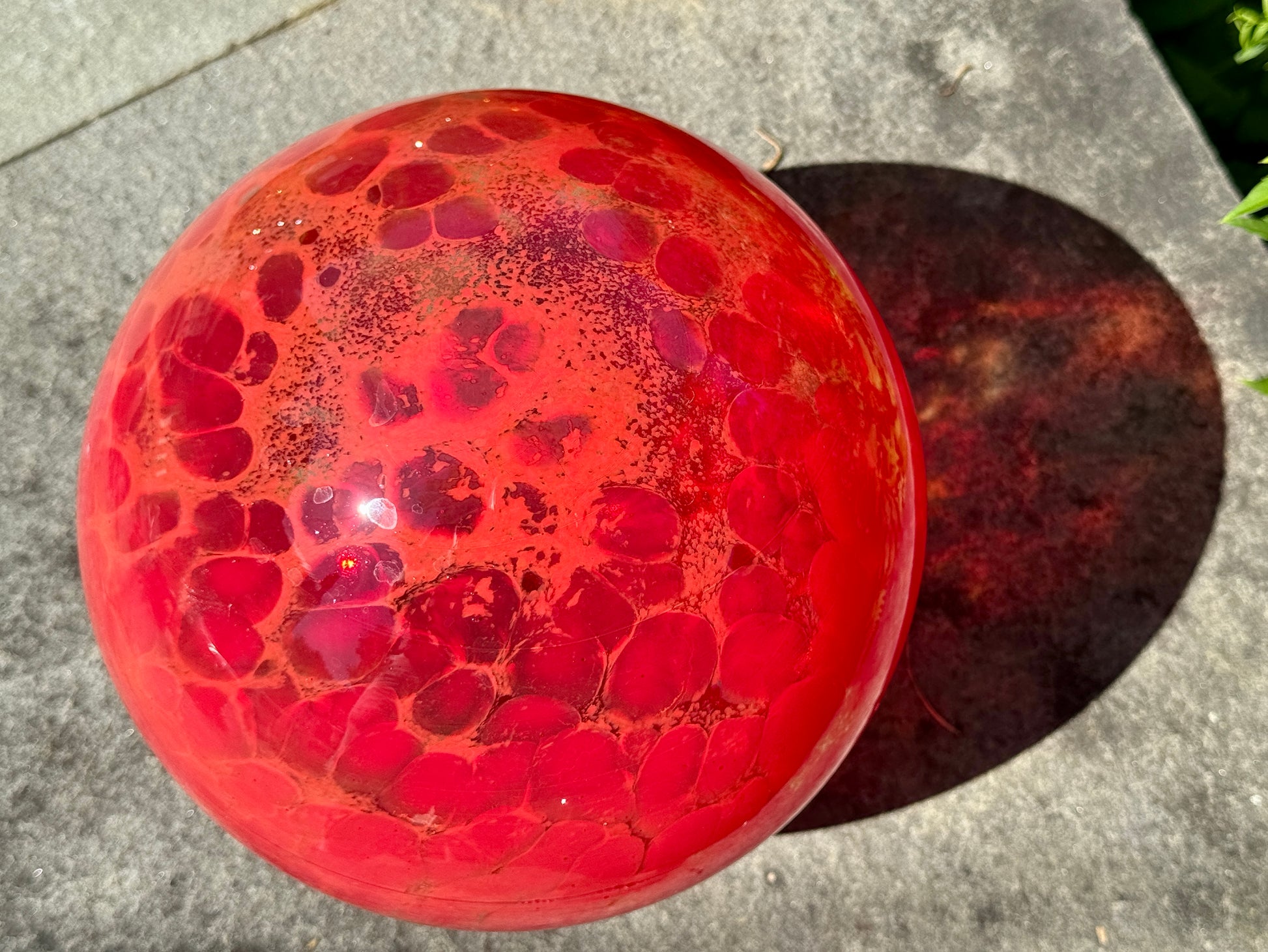 These handblown glass garden or home ornaments come in a variety of colors and sizes. Each one is patterned with a lattice-like pattern in opaque and transparent colored glass, except for the metallic green balls. Those are colored with a single color, Silver Green, on the outside and then reduced with a propane torch, to create a reflective metallic surface just before being put away in the annealer.