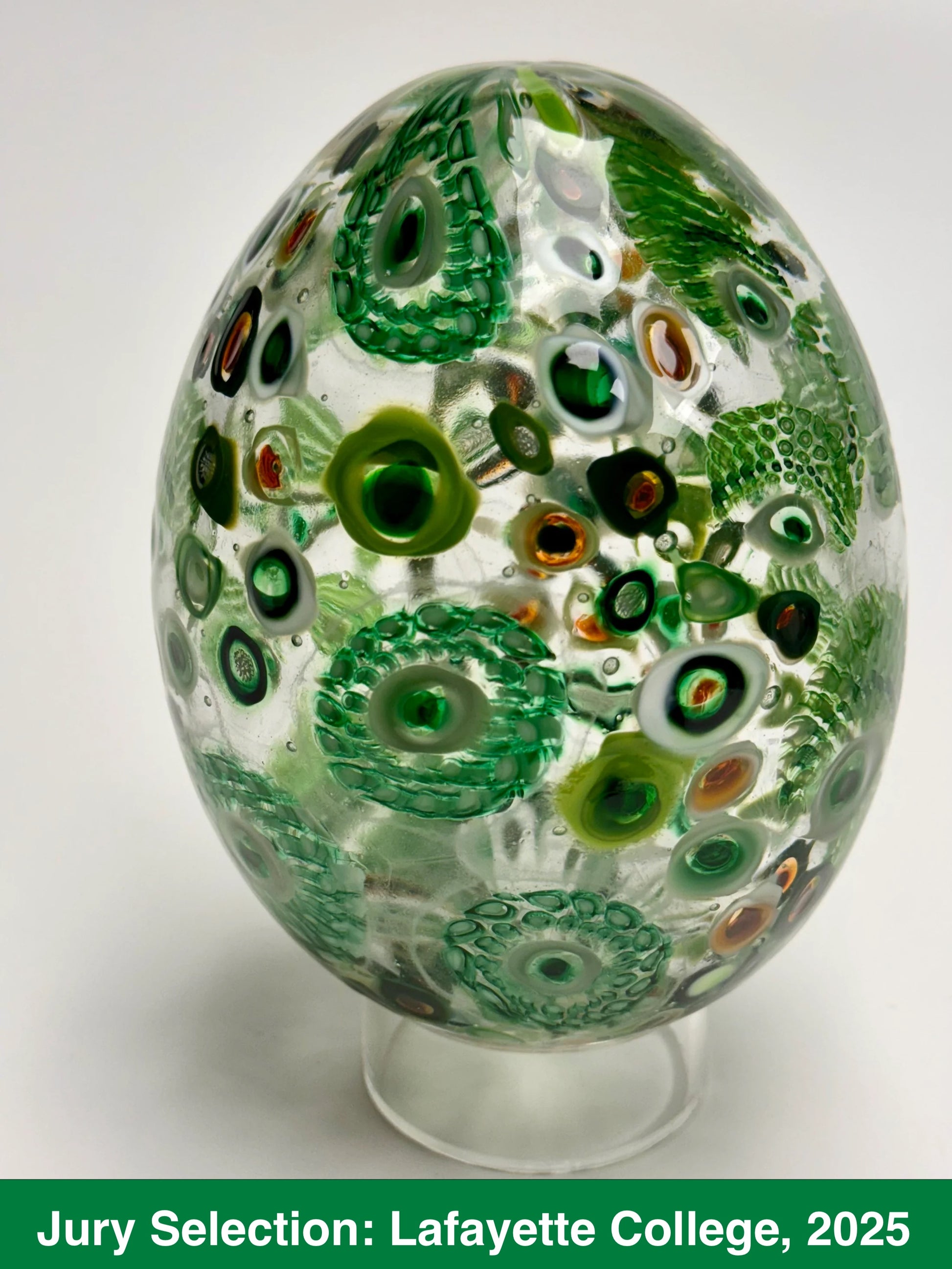Murrine are fabricated by first pulling canes (rods of colored glass), often complex canes with multiple layers of color (one studio day). For this piece, some of those canes were chopped directly into short segments. Others were cut into 5-6 inch long segments that were then assembling into a patterned bundle (another day). The completed bundles were heated in a kiln, picked up on a blowpipe, fused together and then that fused bundle is pulled out into a rod approximately a half-inch to an inch in diameter (another day). That rod was then broken or cut into disks (another day), which are called murrine. To make this piece, these murrine and the short segments of cane were laid out in a two-dimensional sheet, heated to fuse them together, and then rolled up into a three-dimensional object (another day). This sculpture is sold with a transparent acrylic ring to support it for display, as seen in the images. This “jeweled egg” sculpture is one of a kind and was blown by the artist (David L Smith) with a unique shape and pattern. Because this is hand-blown, there are small bubbles and tool marks present in the piece. These are artifacts of the process and testify to its handblown nature. This sculpture is a piece of art and is signed and dated (2024) by the artist. Inspired by the famed eggs once presented to the royal families of Russia by a certain jeweler, but also infused with contemporary flair, the egg is a treasure sure to be cherished by anyone lucky enough to acquire it. It makes the perfect gift for that hard-to-shop-for person on your list. It's for sure they don't already have this one-of-a-kind piece of art!